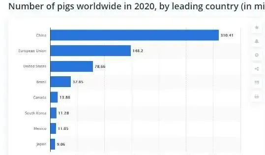 根據STATISTA數據公布統(tǒng)計,截至2020年4月,中國擁有3.1億頭生豬,歐盟有1.48億頭美國有0.78億頭,占據世界前三位。目前全球生豬總量約為6.67億頭豬,相比2019年同期的7.76億頭下降了約1.1億頭。